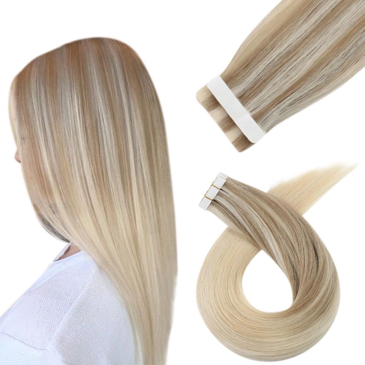 Tape-in extensions are thin, 1-inch wide, pre-taped, medical-grade adhesive wefts that are applied in a "sandwich" method to enhance hair length and volume. They are considered semi-permanent and, if applied by professionals, can last for 4-8 weeks, are reusable for up to a year, and offer a comfortable, natural-looking result.